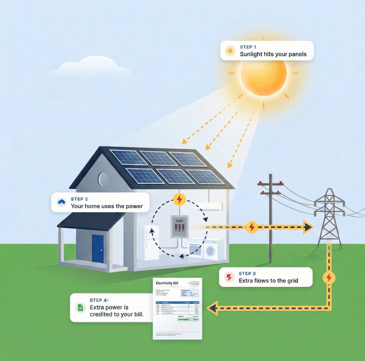 When your panels produce more than your home needs, the extra flows to the grid. Your utility credits you for it on your next bill.